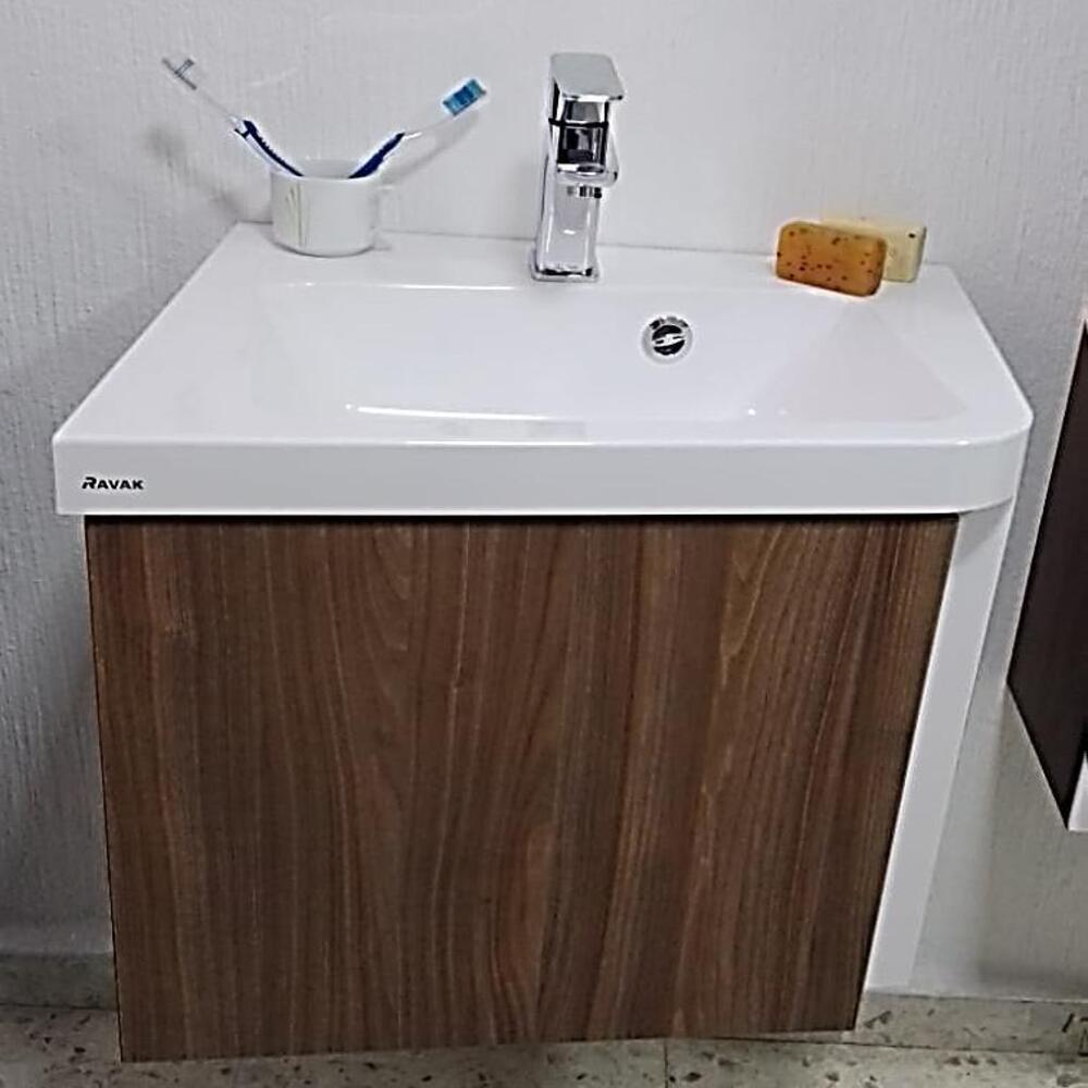 Armario 10° con lavabo esquinero, Medidas (Largo x Ancho x Alto): 55 x 48.5 x 45 cm, Material: tablero MFPB y MDF tratado. Tipo: Izquierdo, Color: Melanina Nogal Oscuro.