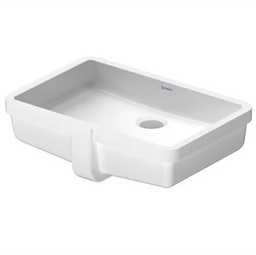Lavabo bajo cubierta blanco, empotrado, rectificado, con rebosadero, sin bancada para grifería, sin orificio para grifería. Dimensiones: 485 x 315 mm.