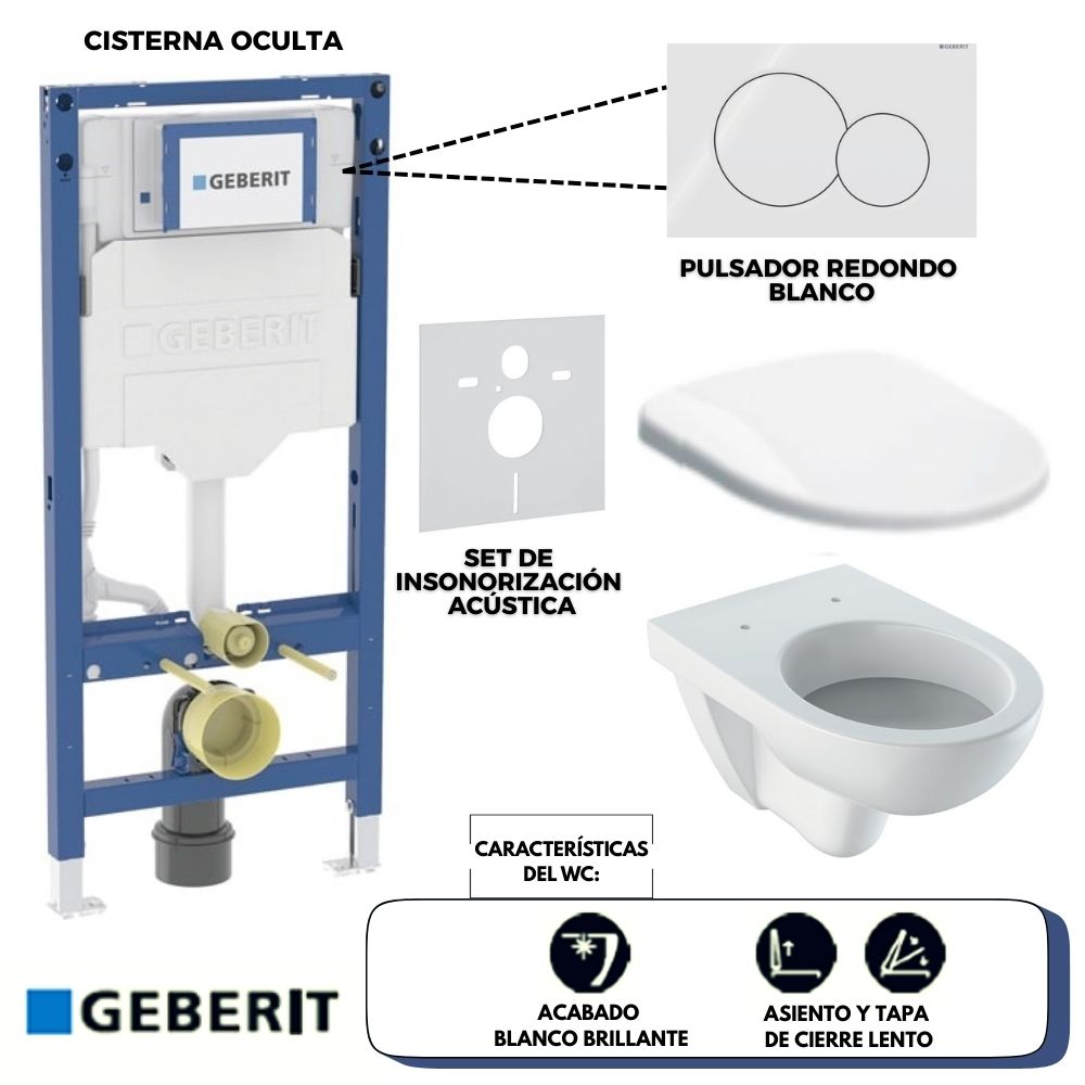 Set de Inodoro Geberit, Modelo: Selnova Round, con Asiento y Tapa, Cisterna Oculta y Pulsador (acabado Blanco Brillante) – Línea Sigma