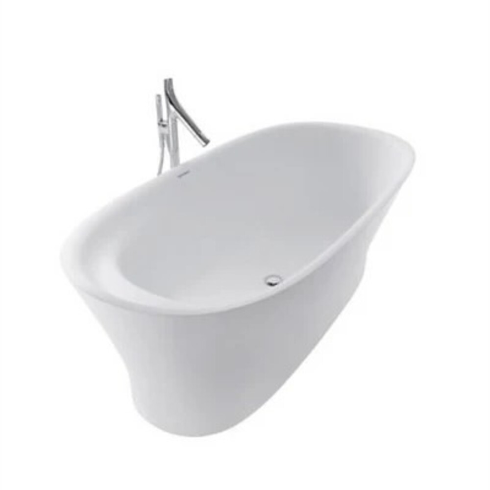 Tina blanca, exenta, con faldón integrado y bastidor, con una inclinación dorsal, con vaciador automático, con rebosadero especial. Material: DuroCast Plus. Dimensiones: 1855 x 885 mm.