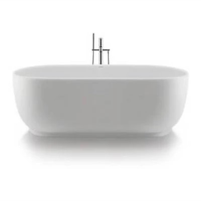 Tina blanca, exenta, con faldón integrado y bastidor, con dos inclinaciones dorsales, con vaciador automático, con rebosadero especial. Material: DuroCast Plus. Dimensiones: 1800 x 800 mm.