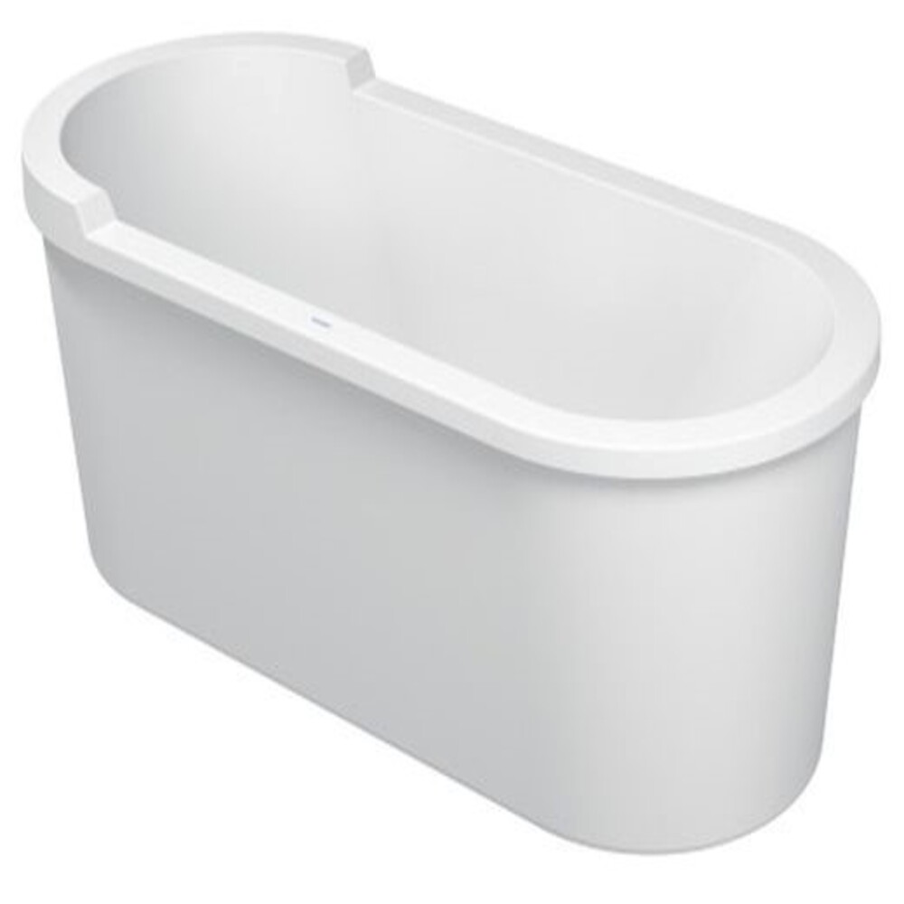 Tina ovalada blanca, exenta, con dos inclinaciones dorsales, con faldón acrílico y bastidor. Material: acrílico sanitario. Incluye desagüe. Dimensiones: 1800 x 800 mm.